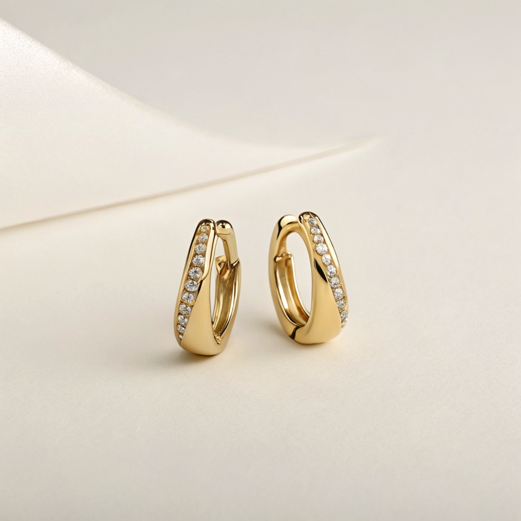 The curved form hugs the ear comfortably, creating a refined balance between modern minimalism and timeless sparkle. Perfect worn alone or layered with other favorites, these huggies transition seamlessly from day to night, adding a touch of understated luxury to any look.
